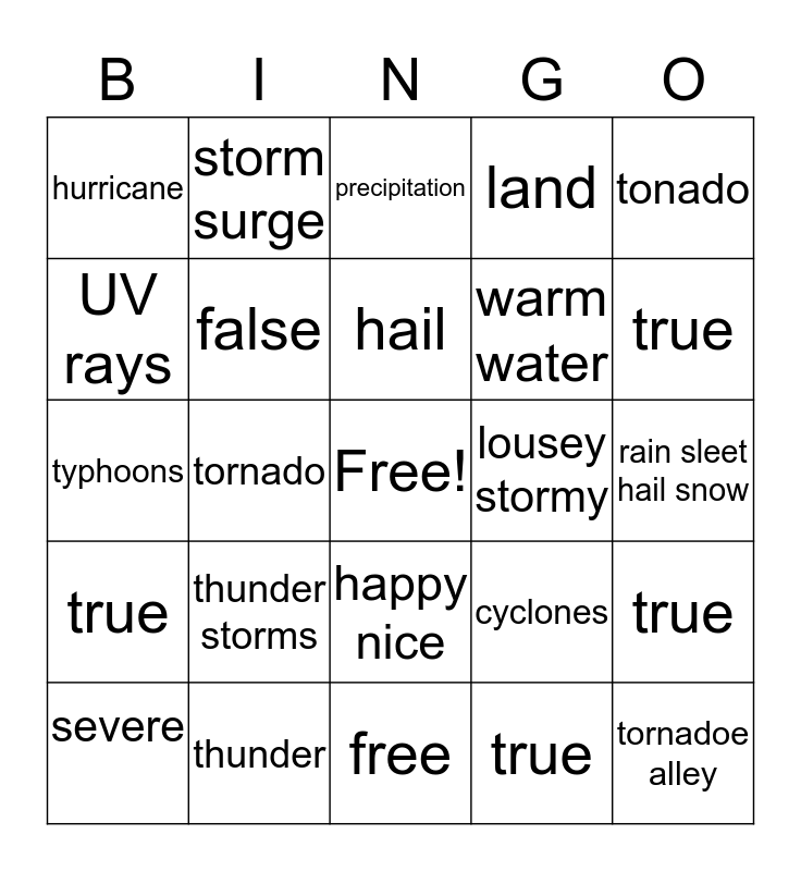 This bingo card has a free space and 24 words: thunder storms, thunder, hail, severe, tonado, hurricane, UV rays, storm surge, lousey stormy, happy nice, warm water, typhoons, cyclones, true, false, true, rain sleet hail snow, precipitation, true, tornado, tornadoe alley, true, land and free.