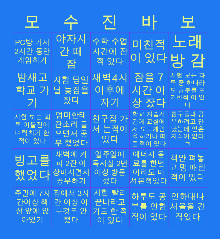 This bingo card has a free space and 24 words: 새벽에 커피 2잔 이상마시면서 공부하기, 집에서 3시간 이상 아무것도 안했다, 새벽4시 이후에 자기, 주말에 7시간이상 책상 앞에 앉아있기, 노래방 감, PC방 가서 2시간 동안 게임하기, 밤새고 학교 가기, 야자시간 때 잠, 학교 자습시간에 교실에서 보드게임을 하거나 떠든 적이 있다, 일주일에 독서실 2번 이싱 방문했다, 잠을 7시간 이상 잤다, 시험 보는 과목 이틀전에 벼락치기 한 적이 있다, 에너지 음료를 한번이라도 마셔본적있다, 책만 펴놓고 멍 때린적이 있다, 시험 당일날 늦잠을 잤다, 하루도 공부를 안한 적이 있다, 친구들과 공부하려고 만났는데 얻은지식이 없다ㅋ, 수학 수업시간에 잔 적 있다, 시험 보는 과목 중 하나라도 공부를 포기한적 이 있다, 엄마한테 잔소리 들으면서 공부 했었다, 인하대나 서울을 간적있다, 빙고를 했었다, 미친적이 있다 and 시험 빨리 끝나라고 기도 한 적이 있다.