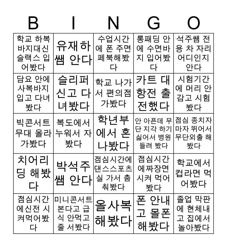 This bingo card has a free space and 24 words: 박석주 쌤 안다, 미니콘서트 본다고 급식 안먹고 줄 서봤다, 학교 나가서 편의점 가봤다, 점심시간에신전 시켜먹어봤다, 석주쌤 전용 차 자리 어디인지 안다, 학교 하복바지대신 슬랙스 입어봤다, 담요 안에 사복바지입고 다녀봤다, 유재하 쌤 안다, 안 아픈데 무단 지각 하기 싫어서 병원 들려 봤다, 점심시간에 댄스스포츠실 가서 춤 춰봤다, 카트 대항전 출전했다, 빅콘서트 무대 올라가봤다, 점심시간에짜장면 시켜 먹어봤다, 학교에서 컵라면 먹어봤다, 슬리퍼 신고 다녀봤다, 폰 안내고 몰폰해봤다, 점심 종치자마자 뛰어서 무단외출 해봤다, 수업시간에 폰 주면 페북해봤다, 시험기간에 머리 안감고 시험봤다, 복도에서 누워서 자 봤다, 졸업 막판에 현체내고 집에서 놀아봤다, 치어리딩 해봤다, 롱패딩 안에 수면바지 입어봤다 and 올사복 해봤다.