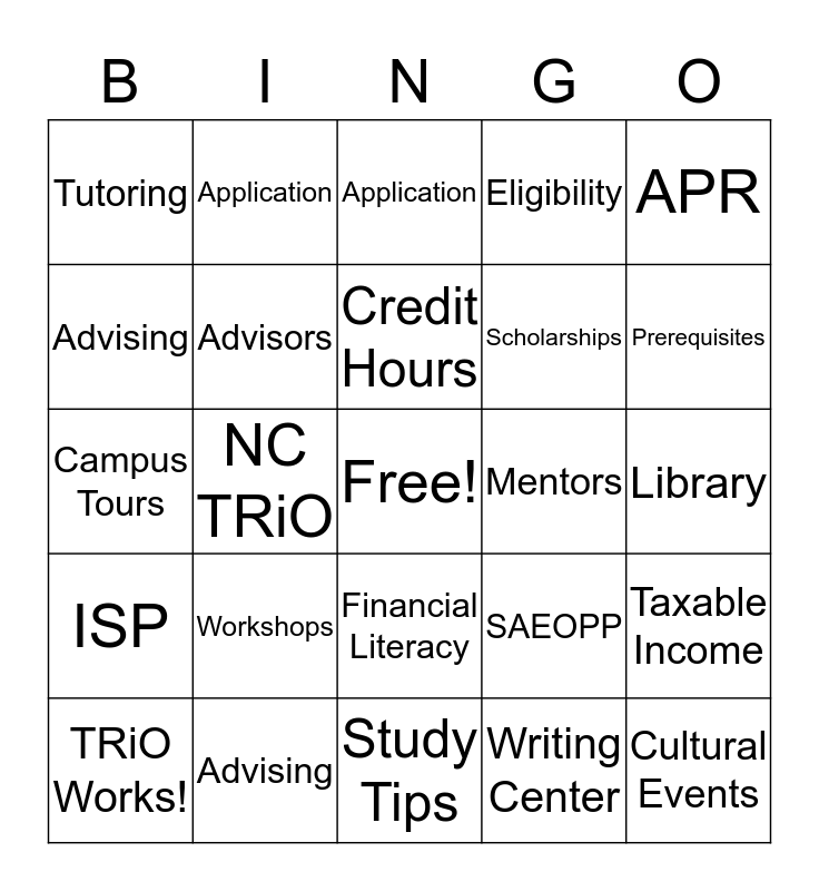 This bingo card has a free space and 29 words: TRiO Works!, Interview, NC TRiO, Workshops, Tutoring, Application, Advisors, Workshops, Mentors, Advising, Library, Cultural Events, Study Tips, Writing Center, Prerequisites, Learning Center, Financial Literacy, ISP, APR, Campus Tours, SAEOPP, GPA, Scholarships, Advising, Eligibility, Application, Taxable Income, Credit Hours and Transfer Advising.