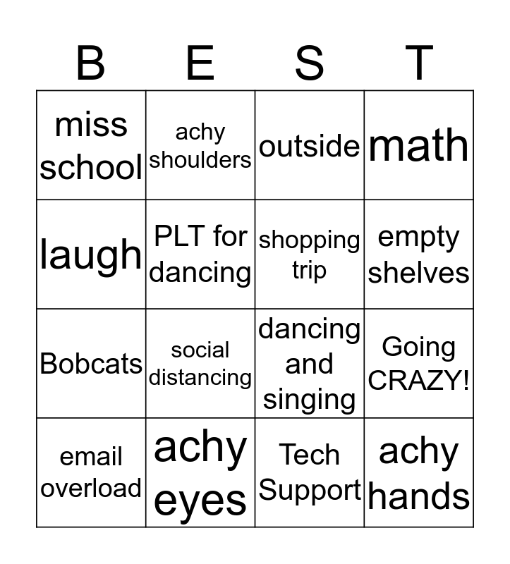 This bingo card has 1 images and 26 words: Free!, Bobcats, Seesaw, PLT for dancing, outside, achy shoulders, achy hands, achy eyes, ZOOM!, dancing and singing, math, Lysol wipes, wash hands, social distancing, 6 feet, shopping trip, empty shelves, message from a child, miss school, Tech Support, @helpdesk, Going CRAZY!, email overload, pajamas, laugh and family.