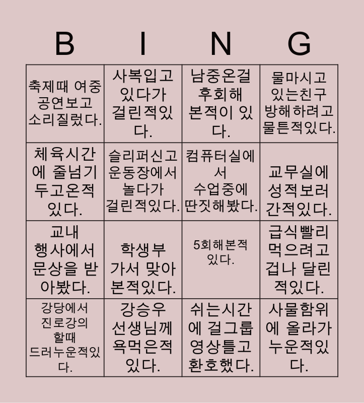 This bingo card has 16 words: 강승우 선생님께 욕먹은적있다., 급식빨리 먹으려고 겁나 달린적있다., 남중온걸 후회해 본적이 있다., 축제때 여중 공연보고 소리질렀다., 교내 행사에서 문상을 받아봤다., 사복입고 있다가 걸린적있다., 5회해본적있다., 쉬는시간에 걸그룹 영상틀고 환호했다., 체육시간에 줄넘기 두고온적있다., 슬리퍼신고 운동장에서 놀다가 걸린적있다., 강당에서 진로강의 할때 드러누운적있다., 물마시고 있는친구 방해하려고 물튼적있다., 학생부 가서 맞아본적있다., 교무실에 성적보러 간적있다., 컴퓨터실에서 수업중에 딴짓해봤다. and 사물함위에 올라가 누운적있다..