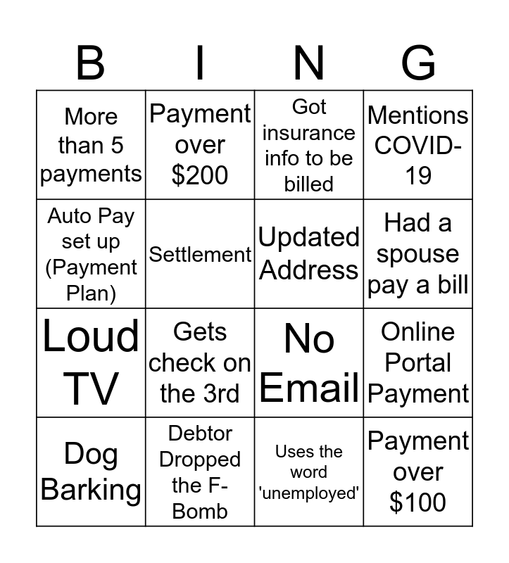 This bingo card has 16 words: Debtor Dropped the F-Bomb, Online Portal Payment, Got insurance info to be billed, More than 5 payments, Loud TV, Payment over $200, No Email, Uses the word 'unemployed', Auto Pay set up (Payment Plan), Settlement, Dog Barking, Mentions COVID-19, Gets check on the 3rd, Had a spouse pay a bill, Updated Address and Payment over $100.