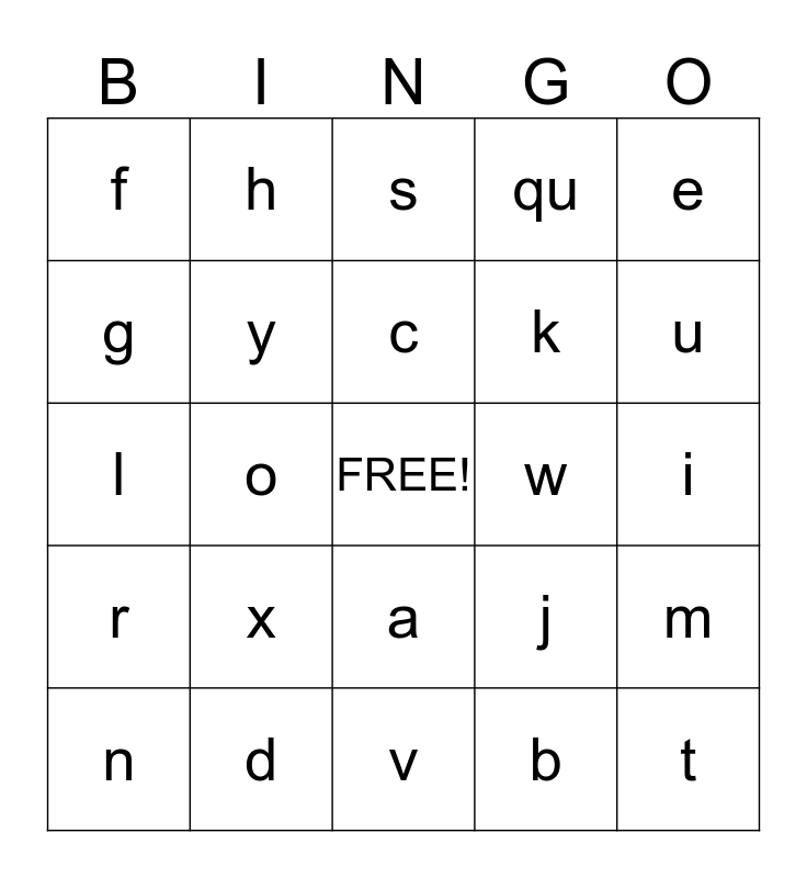 This bingo card has a free space and 26 words: a, b, c, d, e, f, g, h, i, j, k, l, m, n, o, p, qu, r, s, t, u, v, w, x, y and z.