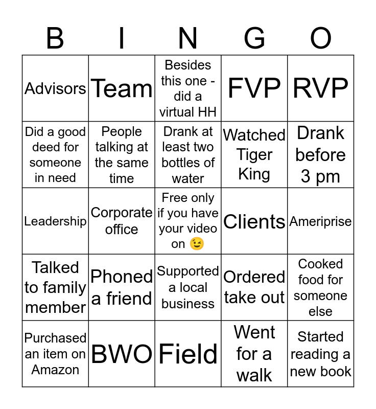 This bingo card has a free space and 24 words: Purchased an item on Amazon, Phoned a friend, Drank at least two bottles of water, Went for a walk, RVP, Advisors, Team, Besides this one - did a virtual HH, Clients, Ameriprise, Leadership, People talking at the same time, Ordered take out, Cooked food for someone else, Did a good deed for someone in need, BWO, Field, FVP, Drank before 3 pm, Talked to family member, Corporate office, Supported a local business, Watched Tiger King and Started reading a new book.