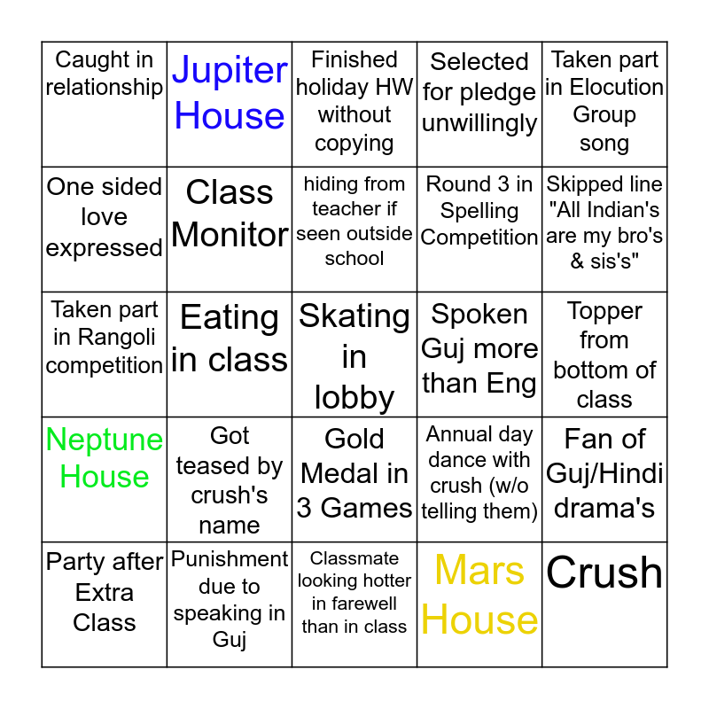 This bingo card has 35 words: Became prefect!, Fav food Khichdi on Saturday, Copied holiday homework, Round 3 in Spelling Competition, Crush, Caught in relationship, Class Monitor, Venus House, Spoken Guj more than Eng, Topper of class, Taken part in Rangoli competition, Jupiter House, Gold Medal in 3 Games, Cheated in test/exams, Taken part in Elocution Group song, Neptune House, Punishment due to speaking in Guj, Finished holiday HW without copying, Mars House, Topper from bottom of class, Party after Extra Class, Eating in class, Skating in lobby, Speeding after Extra Class, Skipped line "All Indian's are my bro's & sis's", One sided love expressed, visiting each class for bday candy to teachers, Classmate looking hotter in farewell than in class, Annual day dance with crush (w/o telling them), Fan of Guj/Hindi drama's, School Trips were fun, Got teased by crush's name, hiding from teacher if seen outside school, Selected for pledge unwillingly and Slept in at least one Class.
