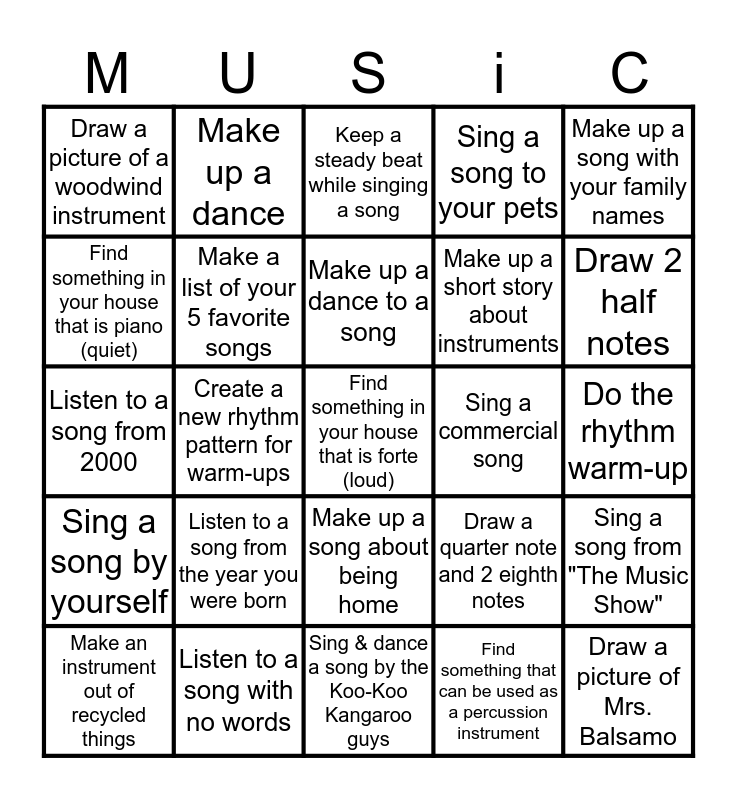 This bingo card has 1 images, a free space and 24 words: Make an instrument out of recycled things, Listen to a song from the year you were born, Make up a dance to a song, Find something that can be used as a percussion instrument, Draw 2 half notes, Draw a picture of a woodwind instrument, Make up a dance, Keep a steady beat while singing a song, Make up a short story about instruments, Sing a song from "The Music Show", Listen to a song from 2000, Make a list of your 5 favorite songs, Draw a quarter note and 2 eighth notes, Draw a picture of Mrs. Balsamo, Find something in your house that is piano (quiet), Listen to a song with no words, Sing & dance a song by the Koo-Koo Kangaroo guys, Sing a song to your pets, Do the rhythm warm-up, Sing a song by yourself, Create a new rhythm pattern for warm-ups, Make up a song about being home, Sing a commercial song and Make up a song with your family names.