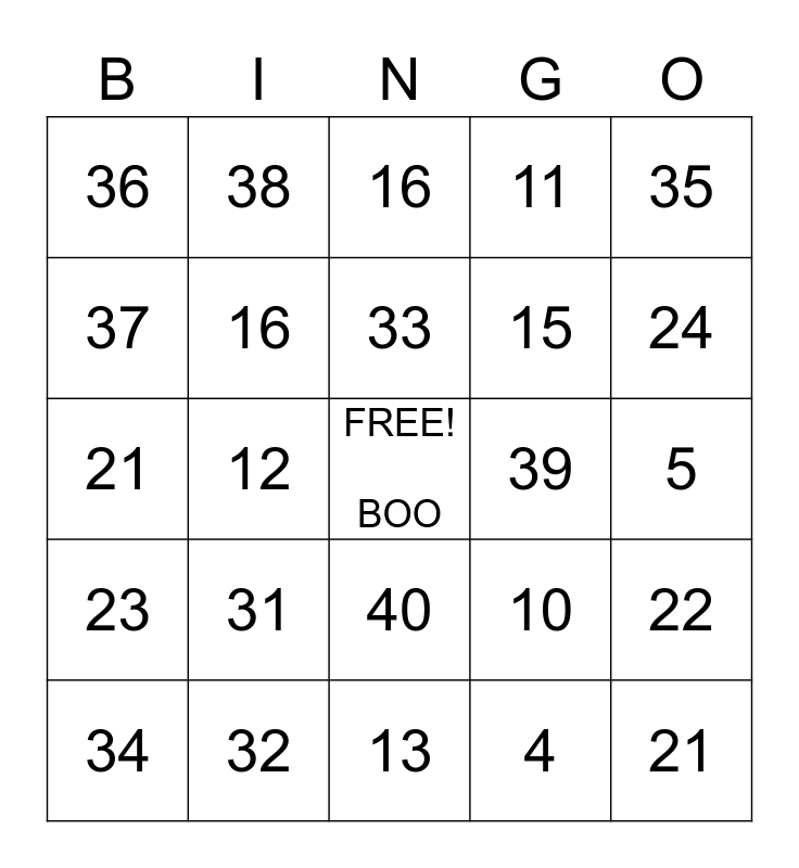 This bingo card has a free space and 24 words: 31, 32, 33, 34, 35, 36, 37, 38, 39, 40, 15, 21, 10, 22, 16, 4, 5, 16, 24, 12, 21, 23, 11 and 13.
