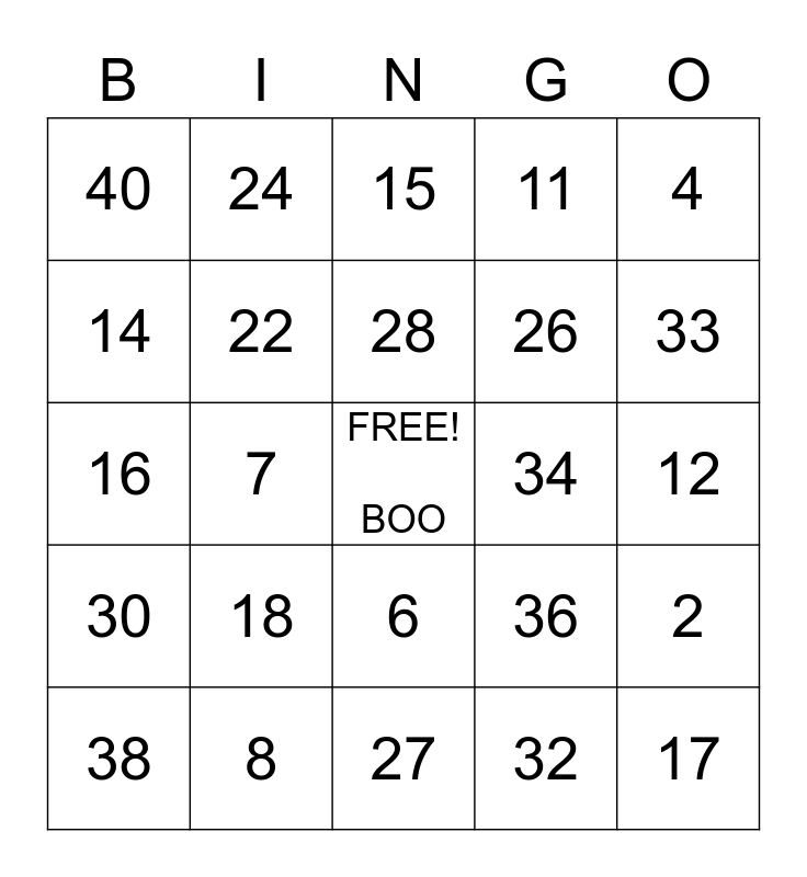 This bingo card has a free space and 24 words: 18, 8, 28, 38, 4, 40, 14, 24, 34, 6, 26, 16, 36, 2, 22, 32, 12, 15, 33, 7, 17, 30, 11 and 27.