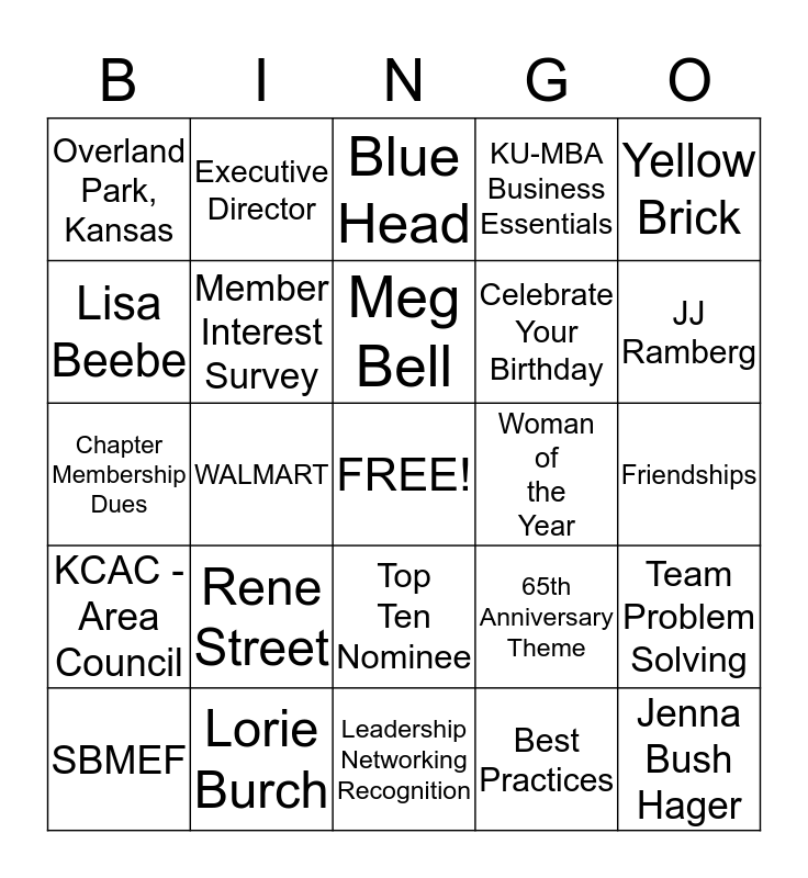 This bingo card has a free space and 24 words: Rene Street, Lorie Burch, Meg Bell, SBMEF, Yellow Brick, Overland Park, Kansas, Lisa Beebe, Executive Director, Woman of the Year, Top Ten Nominee, Celebrate Your Birthday, Chapter Membership Dues, 65th Anniversary Theme, Team Problem Solving, Member Interest Survey, Best Practices, Friendships, Blue Head, JJ Ramberg, WALMART, Jenna Bush Hager, KCAC - Area Council, KU-MBA Business Essentials and Leadership Networking Recognition.