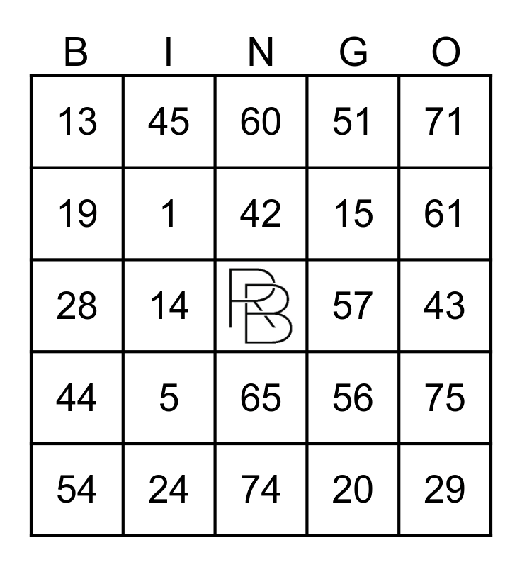 This bingo card has a free space and 24 words: 5, 24, 42, 54, 71, 13, 19, 45, 57, 65, 15, 28, 56, 75, 1, 20, 43, 60, 61, 14, 29, 44, 51 and 74.