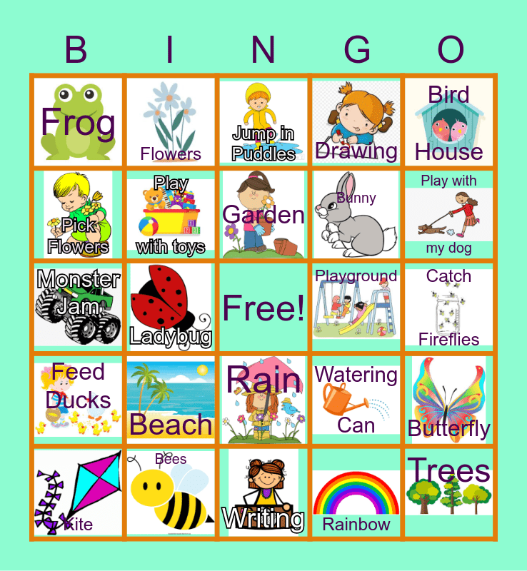 This bingo card has 28 images, a free space and 28 words: Butterfly, Playing Tag, Bunny, Rainbow, Pick Flowers, Jump in Puddles, Flowers, Feed Ducks, Playground, Kite, Monster Jam, Drawing, Bees, Writing, Play with my dog, Take a Walk, Beach, Play with toys, Garden, Rain, Frog, Birds, Trees, Ladybug, Catch Fireflies, Watering Can, Bird House and Hatch Chicks.