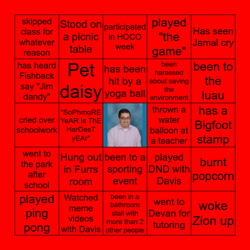 This bingo card has a free space and 24 words: Hung out in Furrs room, Watched meme videos with Davis, has been hit by a yoga ball, played ping pong, Has seen Jamal cry, skipped class for whatever reason, has heard Fishback say "Jim dandy", Stood on a picnic table, thrown a water balloon at a teacher, been to a sporting event, been harassed about saving the environment, cried over schoolwork, played DND with Davis, burnt popcorn, Pet daisy, went to Devan for tutoring, has a Bigfoot stamp, participated in HOCO week, been to the luau, "SoPhmoRE YeAR Is ThE HarDesT yEAr", woke Zion up, went to the park after school, played "the game" and been in a bathroom stall with more than 2 other people.