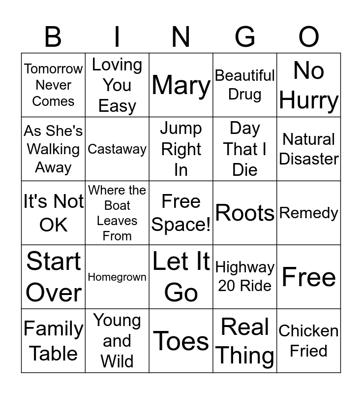 This bingo card has a free space and 49 words: Someone I Used to Know, Chicken Fried, Knee Deep, Toes, Homegrown, Colder Weather, Loving You Easy, Whatever It Is, As She's Walking Away, My Old Man, Castaway, Beautiful Drug, Free, Highway 20 Ride, Sweet-Annie, Goodbye In Her Eyes, Jump Right In, Roots, Island Song, No Hurry, Where the Boat Leaves From, Real Thing, Tomorrow Never Comes, Day That I Die, Jolene, Natural Disaster, Family Table, 2 Places at 1 Time, Let It Go, Start Over, Different Kind of Fine, Long Haul, Whiskey's Gone, Trying to Drive, Young and Wild, All Alright, Wildfire, Mango Tree, Remedy, Sic 'Em On a Chicken, The Woods, Leaving Love Behind, Your Majesty, Uncaged, It's Not OK, Mary, Free/Into the Mystic, Heavy is the Head and One Day.