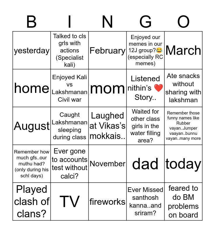 This bingo card has a free space and 40 words: Attended Gopal’s classes just to troll him, Caught Lakshmanan sleeping during class, Enjoyed seetha’s horror stories, Waited for other class girls in the water filling area?, feared to do BM problems on board, Remember seetha’s olus ..especially pulsar 250🔥, Enjoyed Kali vs Lakshmanan Civil war, As well as Kavin vs Seetha😨, Listened nithin’s ❤️ Story.., Remember those funny names like Rubber vayan..Jumper vaayan..bunnu vayan..many more, Remember how much gfs..our muthu had?(only during his schl days), Talked to cls grls with actions (Specialist kali), Ever Missed santhosh kanna..and sriram?, Ate snacks without sharing with lakshman, Played clash of clans?, Ever gone to accounts test without calci?, Listened to nithin’s songs?, Enjoyed our memes in our 12J group?😂(especially RC memes), Have u ever joined hands to irritate gopal sir and ended up sir leaving the class, home, TV, mom, dad, March, shoes, socks, fireworks, January, July, May, April, February, June, today, August, September, November, October, yesterday and tomorrow.
