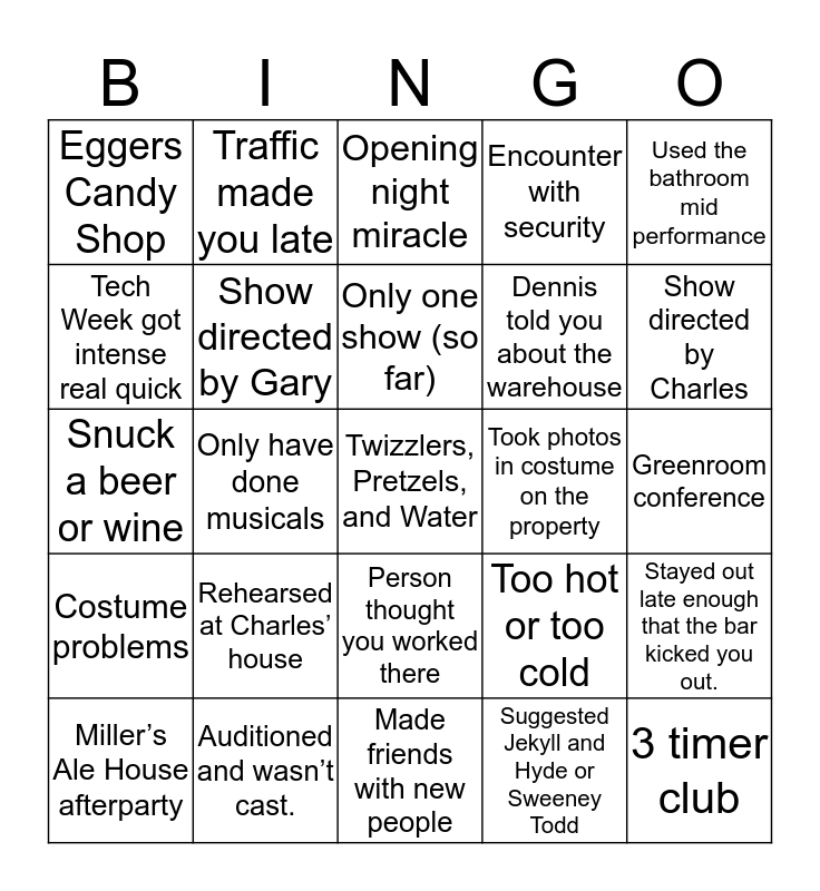 This bingo card has a free space and 24 words: Rehearsed at Charles’ house, Auditioned and wasn’t cast., Only one show (so far), Miller’s Ale House afterparty, Used the bathroom mid performance, Eggers Candy Shop, Tech Week got intense real quick, Traffic made you late, Took photos in costume on the property, Person thought you worked there, Dennis told you about the warehouse, Snuck a beer or wine, Too hot or too cold, Stayed out late enough that the bar kicked you out., Show directed by Gary, Suggested Jekyll and Hyde or Sweeney Todd, Greenroom conference, Opening night miracle, Show directed by Charles, Only have done musicals, 3 timer club, Costume problems, Encounter with security and Made friends with new people.