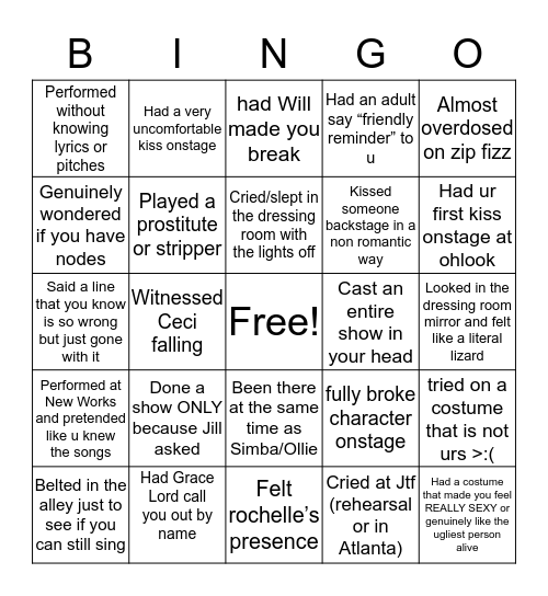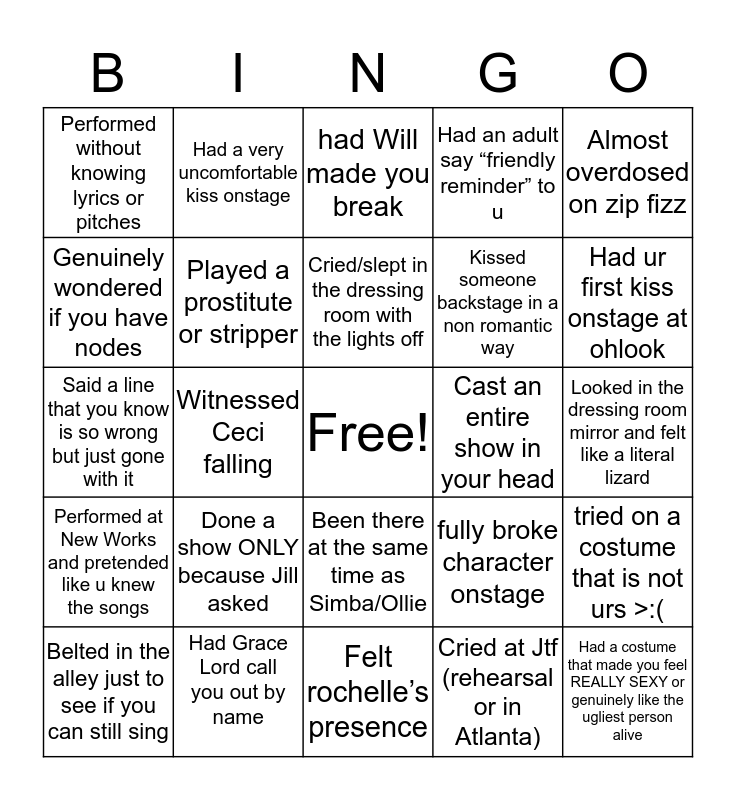 This bingo card has a free space and 24 words: Done a show ONLY because Jill asked, Had Grace Lord call you out by name, Cried/slept in the dressing room with the lights off, Belted in the alley just to see if you can still sing, Almost overdosed on zip fizz, Performed without knowing lyrics or pitches, Genuinely wondered if you have nodes, Had a very uncomfortable kiss onstage, Cast an entire show in your head, Been there at the same time as Simba/Ollie, Kissed someone backstage in a non romantic way, Said a line that you know is so wrong but just gone with it, fully broke character onstage, tried on a costume that is not urs >:(, Played a prostitute or stripper, Cried at Jtf (rehearsal or in Atlanta), Looked in the dressing room mirror and felt like a literal lizard, had Will made you break, Had ur first kiss onstage at ohlook, Witnessed Ceci falling, Had a costume that made you feel REALLY SEXY or genuinely like the ugliest person alive, Performed at New Works and pretended like u knew the songs, Had an adult say “friendly reminder” to u and Felt rochelle’s presence.