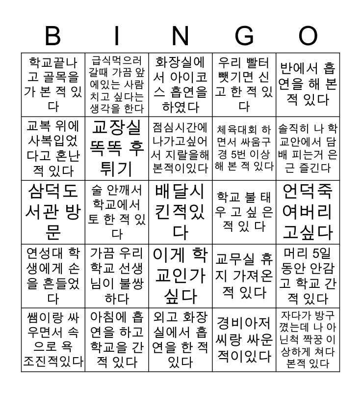 This bingo card has a free space and 24 words: 쌤이랑 싸우면서 속으로 욕 조진적있다, 가끔 우리 학교 선생님이 불쌍하다, 점심시간에 나가고싶어서 지랄을해본적이있다, 경비아저씨랑 싸운적이있다, 반에서 흡연을 해 본 적 있다, 학교끝나고 골목을 가 본 적 있다, 급식먹으러 갈때 가끔 앞에있는 사람 치고 싶다는 생각을 한다, 화장실에서 아이코스 흡연을 하였다, 학교 불 태 우 고 싶 은 적 있 다, 언덕죽여버리고싶다, 삼덕도서관 방문, 교장실 똑똑 후 튀기, 교무실 휴지 가져온 적 있다, 머리 5일 동안 안감고 학교 간 적 있다, 교복 위에 사복입었다고 혼난 적 있다, 아침에 흡연을 하고 학교을 간 적 있다, 외고 화장실에서 흡연을 한 적 있다, 우리 빨터 뺏기면 신고 한 적 있다, 솔직히 나 학교안에서 담배 피는거 은근 즐긴다, 연성대 학생에게 손을 흔들었다, 술 안깨서 학교에서 토 한 적 있다, 이게 학교인가 싶다, 체육대회 하면서 싸움구경 5번 이상 해 본 적 있다 and 자다가 방구 꼈는데 나 아닌척 짝꿍 이상하게 쳐다본적 있다.