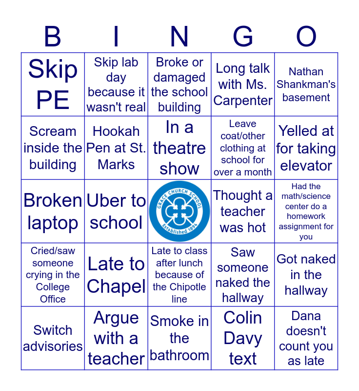 This bingo card has a free space and 24 words: Late to Chapel, Argue with a teacher, In a theatre show, Switch advisories, Nathan Shankman's basement, Skip PE, Scream inside the building, Skip lab day because it wasn't real, Thought a teacher was hot, Late to class after lunch because of the Chipotle line, Leave coat/other clothing at school for over a month, Broken laptop, Saw someone naked the hallway, Got naked in the hallway, Hookah Pen at St. Marks, Colin Davy text, Had the math/science center do a homework assignment for you, Broke or damaged the school building, Yelled at for taking elevator, Uber to school, Dana doesn't count you as late, Cried/saw someone crying in the College Office, Long talk with Ms. Carpenter and Smoke in the bathroom.