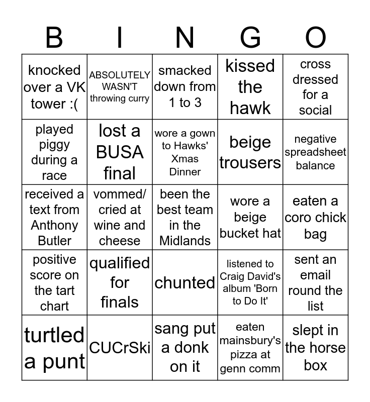 This bingo card has 25 words: qualified for finals, sang put a donk on it, wore a gown to Hawks' Xmas Dinner, turtled a punt, cross dressed for a social, knocked over a VK tower :(, played piggy during a race, ABSOLUTELY WASN'T throwing curry, wore a beige bucket hat, chunted, beige trousers, received a text from Anthony Butler, listened to Craig David's album 'Born to Do It', sent an email round the list, lost a BUSA final, slept in the horse box, eaten a coro chick bag, smacked down from 1 to 3, negative spreadsheet balance, vommed/ cried at wine and cheese, been the best team in the Midlands, CUCrSki, positive score on the tart chart, kissed the hawk and eaten mainsbury's pizza at genn comm.