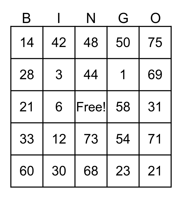 This bingo card has a free space and 24 words: 12, 30, 44, 60, 75, 14, 28, 42, 58, 73, 1, 21, 54, 71, 3, 23, 31, 48, 69, 6, 21, 33, 50 and 68.