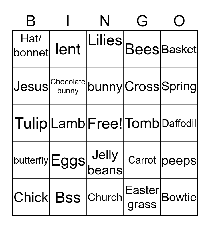 This bingo card has a free space and 24 words: Eggs, Bss, bunny, Chick, Basket, Hat/ bonnet, Jesus, lent, Tomb, Jelly beans, Cross, Tulip, Carrot, peeps, Chocolate bunny, Easter grass, Daffodil, Lilies, Spring, Lamb, Bowtie, butterfly, Bees and Church.