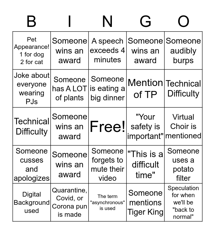This bingo card has a free space and 24 words: Someone wins an award, Quarantine, Covid, or Corona pun is made, Someone is eating a big dinner, Digital Background used, Someone audibly burps, Pet Appearance! 1 for dog 2 for cat, Joke about everyone wearing PJs, Someone wins an award, "Your safety is important", Someone forgets to mute their video, Mention of TP, Technical Difficulty, "This is a difficult time", Someone uses a potato filter, Someone has A LOT of plants, Someone mentions Tiger King, Virtual Choir is mentioned, A speech exceeds 4 minutes, Technical Difficulty, Someone wins an award, Speculation for when we'll be "back to normal", Someone cusses and apologizes, Someone wins an award and The term "asynchronous" is used.