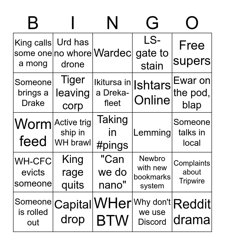 This bingo card has a free space and 24 words: King rage quits, Capital drop, Ikitursa in a Dreka-fleet, Someone is rolled out, Free supers, King calls some one a mong, Someone brings a Drake, Urd has no whore drone, Lemming, "Can we do nano", Ishtars Online, Worm feed, Newbro with new bookmarks system, Complaints about Tripwire, Tiger leaving corp, Why don't we use Discord, Someone talks in local, Wardec, Ewar on the pod, blap, Active trig ship in WH brawl, Reddit drama, WH-CFC evicts someone, LS-gate to stain and WHer BTW.
