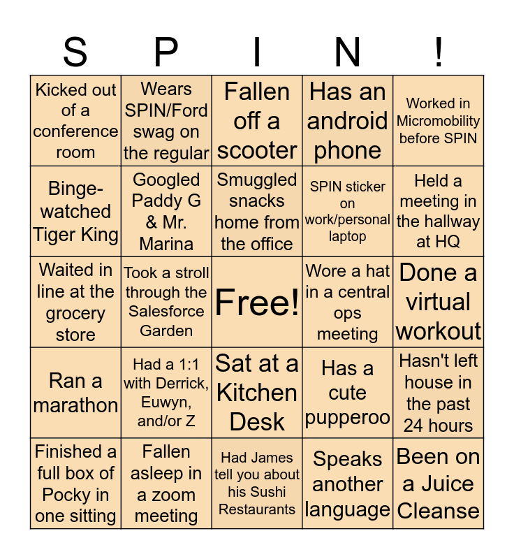 This bingo card has a free space and 29 words: Finished a full box of Pocky in one sitting, Been to Michigan, Took a stroll through the Salesforce Garden, Has more than 10 TP rolls at home right now, Kicked out of a conference room, Fallen off a scooter, Googled Paddy G & Mr. Marina, Had a 1:1 with Derrick, Euwyn, and/or Z, Wore a hat in a central ops meeting, Fallen asleep in a zoom meeting, Done a virtual workout, Been on a Juice Cleanse, Had James tell you about his Sushi Restaurants, Speaks another language, Held a meeting in the hallway at HQ, Attended a zoom happy hour, Sat at a Kitchen Desk, Ran a marathon, Worked in Micromobility before SPIN, Waited in line at the grocery store, Has a cute pupperoo, Been to the top of the Salesforce Tower, SPIN sticker on work/personal laptop, Binge-watched Tiger King, Has an android phone, Wears SPIN/Ford swag on the regular, Hasn't left house in the past 24 hours, Smuggled snacks home from the office and Prefers Philz over Starbucks.