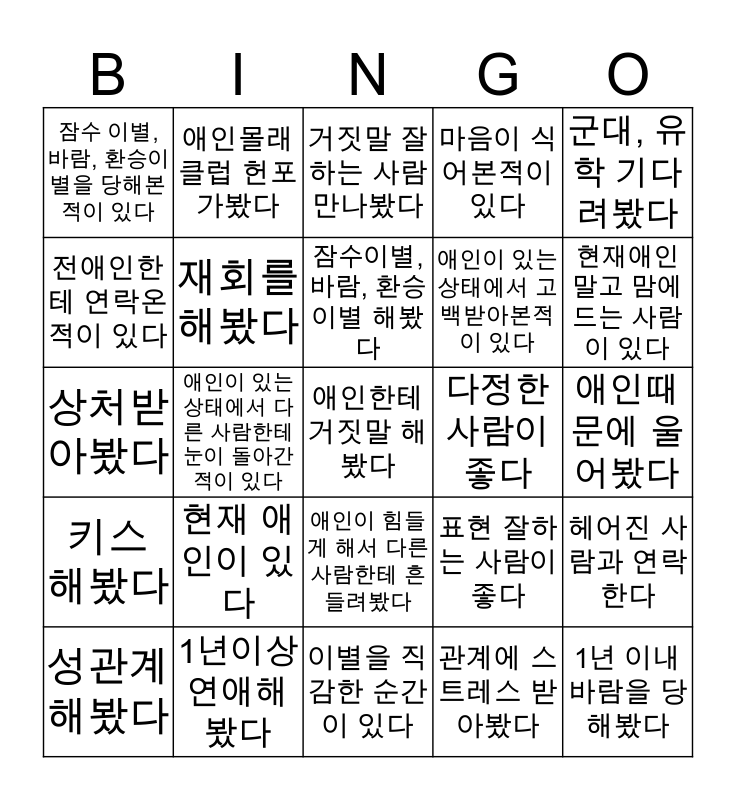 This bingo card has a free space and 24 words: 현재 애인이 있다, 1년이상 연애해봤다, 잠수이별, 바람, 환승이별 해봤다, 성관계 해봤다, 군대, 유학 기다려봤다, 잠수 이별, 바람, 환승이별을 당해본적이 있다, 전애인한테 연락온적이 있다, 애인몰래 클럽 헌포 가봤다, 다정한 사람이 좋다, 애인이 힘들게 해서 다른 사람한테 흔들려봤다, 애인이 있는 상태에서 고백받아본적이 있다, 상처받아봤다, 표현 잘하는 사람이 좋다, 헤어진 사람과 연락한다, 재회를해봤다, 관계에 스트레스 받아봤다, 애인때문에 울어봤다, 거짓말 잘하는 사람 만나봤다, 현재애인말고 맘에드는 사람이 있다, 애인이 있는 상태에서 다른 사람한테 눈이 돌아간적이 있다, 1년 이내 바람을 당해봤다, 키스 해봤다, 마음이 식어본적이 있다 and 이별을 직감한 순간이 있다.