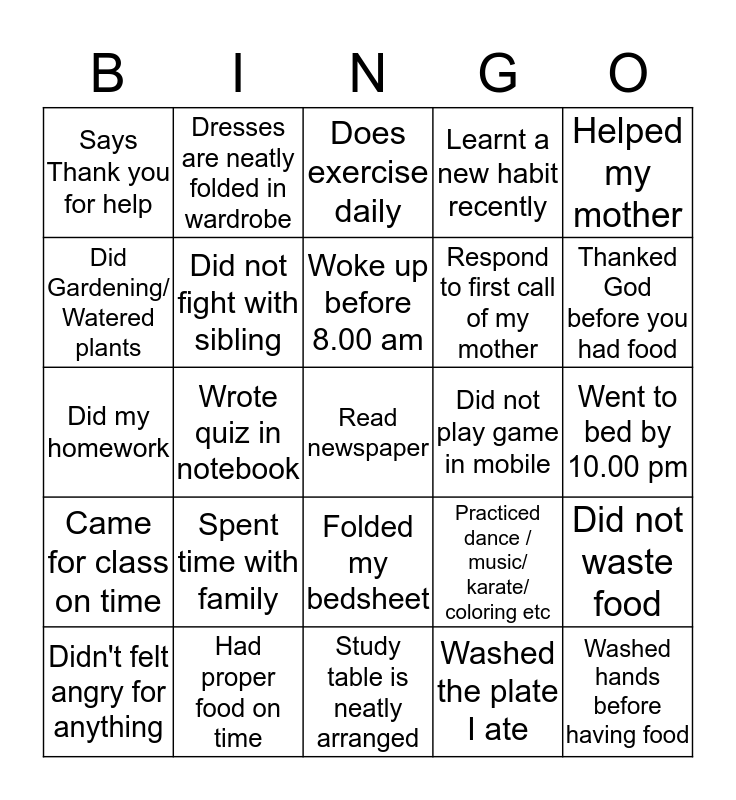 This bingo card has 25 words: Spent time with family, Study table is neatly arranged, Woke up before 8.00 am, Didn't felt angry for anything, Helped my mother, Says Thank you for help, Did Gardening/ Watered plants, Dresses are neatly folded in wardrobe, Did not play game in mobile, Folded my bedsheet, Respond to first call of my mother, Did my homework, Practiced dance / music/ karate/ coloring etc, Did not waste food, Did not fight with sibling, Washed hands before having food, Went to bed by 10.00 pm, Does exercise daily, Thanked God before you had food, Wrote quiz in notebook, Read newspaper, Had proper food on time, Came for class on time, Learnt a new habit recently and Washed the plate I ate.