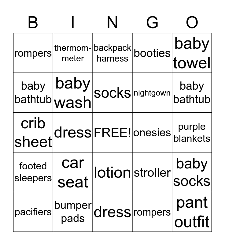 This bingo card has a free space and 33 words: breast pads, booties, dress, high chair, footed sleepers, baby wash, baby towel, pacifiers, thermom-meter, baby sling, socks, backpack harness, diapers, baby wipes, onesies, baby bathtub, bumper pads, crib sheet, car seat, stroller, lotion, baby girl blouses, rompers, purple blankets, dress, pant outfit, booties, nightgown, baby bathtub, baby socks, baby sling, rompers and baby girl blouses.