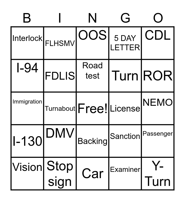 This bingo card has a free space and 25 words: DMV, Car, Road test, Vision, CDL, Interlock, I-94, FLHSMV, License, Backing, Turn, Immigration, Sanction, Passenger, FDLIS, Tanker, NEMO, OOS, ROR, Turnabout, Y-Turn, Stop sign, I-130, 5 DAY LETTER and Examiner.