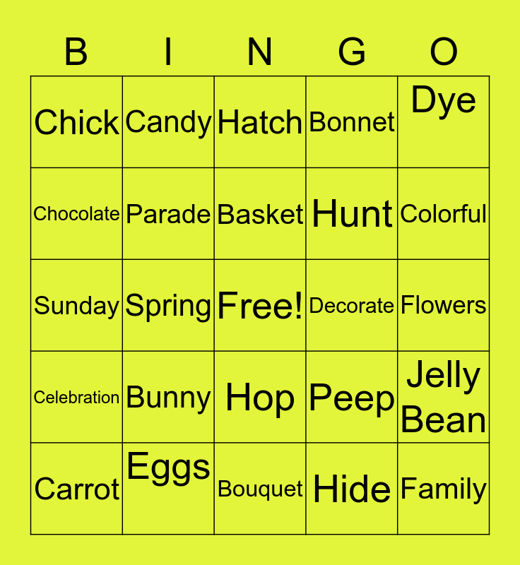 This bingo card has a free space and 24 words: Bunny, Eggs, Basket, Carrot, Dye, Chick, Chocolate, Candy, Decorate, Hop, Hunt, Sunday, Peep, Jelly Bean, Parade, Hide, Flowers, Hatch, Colorful, Spring, Family, Celebration, Bonnet and Bouquet.
