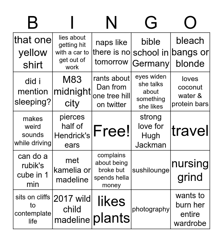 This bingo card has a free space and 24 words: sits on cliffs to contemplate life, met kamelia or madeline, rants about Dan from one tree hill on twitter, photography, bleach bangs or blonde, that one yellow shirt, lies about getting hit with a car to get out of work, naps like there is no tomorrow, strong love for Hugh Jackman, travel, makes weird sounds while driving, M83 midnight city, sushilounge, nursing grind, did i mention sleeping?, 2017 wild child madeline, likes plants, bible school in Germany, loves coconut water & protein bars, can do a rubik's cube in 1 min, pierces half of Hendrick's ears, complains about being broke but spends hella money, eyes widen she talks about something she likes and wants to burn her entire wardrobe.