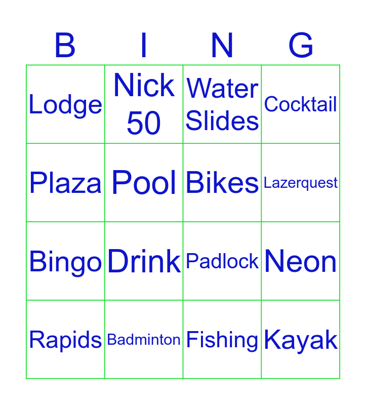 This bingo card has 52 words: Free!, Rapids, Krispy Kreme, Longleat, Squirrel, Night Swim, Nick 50, Jack 21, Pool, Snooker, Bikes, Land Train, Cappuccino, Starbucks, Jardin de Sport, American, Lazerquest, Badminton, Table Tennis, Plaza, Neon, Games Night, Lodge, Bingo, Habitat Lampshade, Talent, Birthday, Party, Drink, Wine, G and T, Cocktail, Milkshake, Waffle, Man Hunt, Water Slides, Races, Pine, Ash, Oak, Maple, Fishing, Kayak, Lake, High Ropes, Parc Market, Family, Padlock, Spa, Crazy Golf, Locker and Swimming Pool.