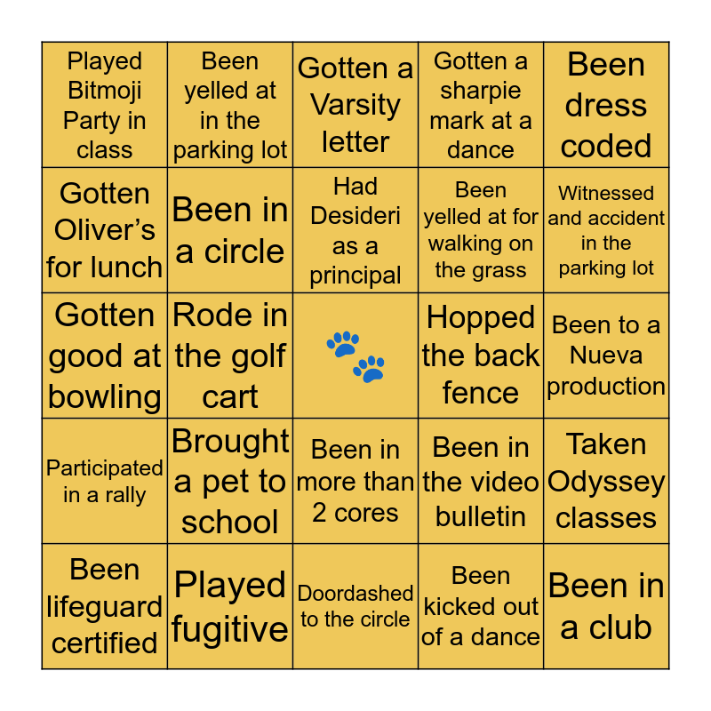 This bingo card has a free space and 24 words: Brought a pet to school, Played fugitive, Had Desideri as a principal, Been lifeguard certified, Been dress coded, Played Bitmoji Party in class, Gotten Oliver’s for lunch, Been yelled at in the parking lot, Hopped the back fence, Been in more than 2 cores, Been yelled at for walking on the grass, Gotten good at bowling, Been in the video bulletin, Taken Odyssey classes, Been in a circle, Been kicked out of a dance, Been to a Nueva production, Gotten a Varsity letter, Witnessed and accident in the parking lot, Rode in the golf cart, Been in a club, Participated in a rally, Gotten a sharpie mark at a dance and Doordashed to the circle.