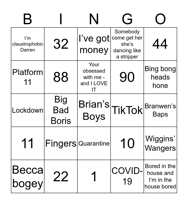 This bingo card has a free space and 24 words: Fingers, 22, Your obsessed with me - and I LOVE IT, Becca bogey, 44, I’m claustrophobic Darren, Platform 11, 32, TikTok, Quarantine, 90, Lockdown, 10, Wiggins’ Wangers, 88, COVID-19, Branwen’s Baps, I’ve got money, Bing bong heads hone, Big Bad Boris, Bored in the house and I’m in the house bored, 11, Somebody come get her she’s dancing like a stripper and 1.