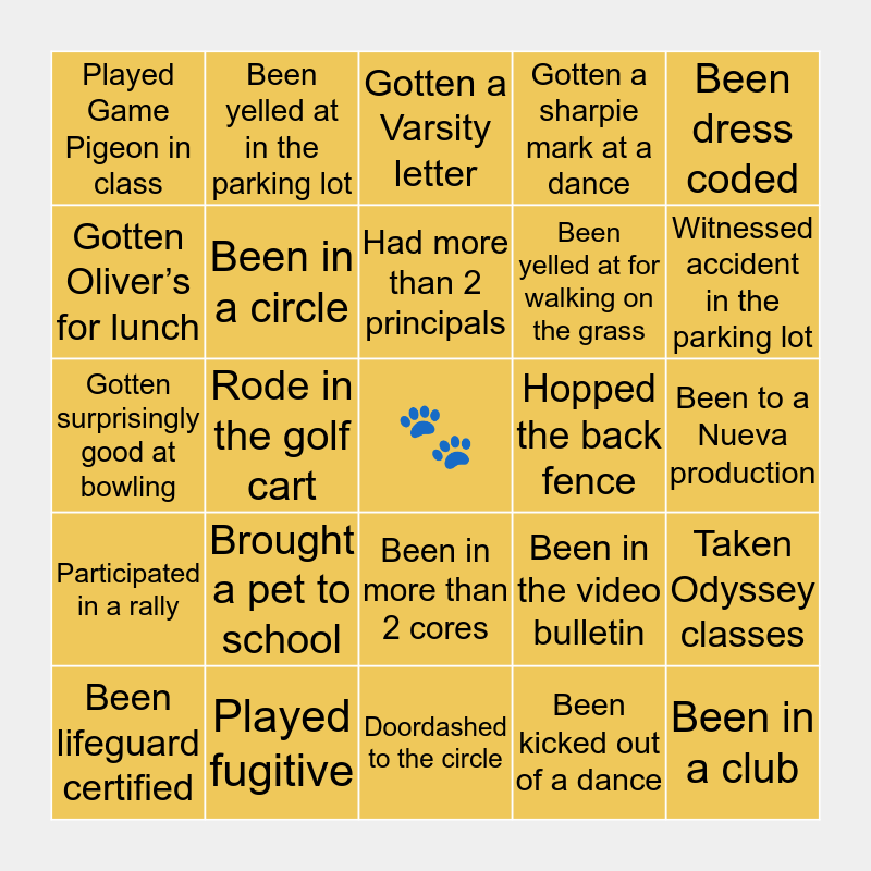This bingo card has a free space and 24 words: Brought a pet to school, Played fugitive, Had more than 2 principals, Been lifeguard certified, Been dress coded, Played Game Pigeon in class, Gotten Oliver’s for lunch, Been yelled at in the parking lot, Hopped the back fence, Been in more than 2 cores, Been yelled at for walking on the grass, Gotten surprisingly good at bowling, Been in the video bulletin, Taken Odyssey classes, Been in a circle, Been kicked out of a dance, Been to a Nueva production, Gotten a Varsity letter, Witnessed accident in the parking lot, Rode in the golf cart, Been in a club, Participated in a rally, Gotten a sharpie mark at a dance and Doordashed to the circle.