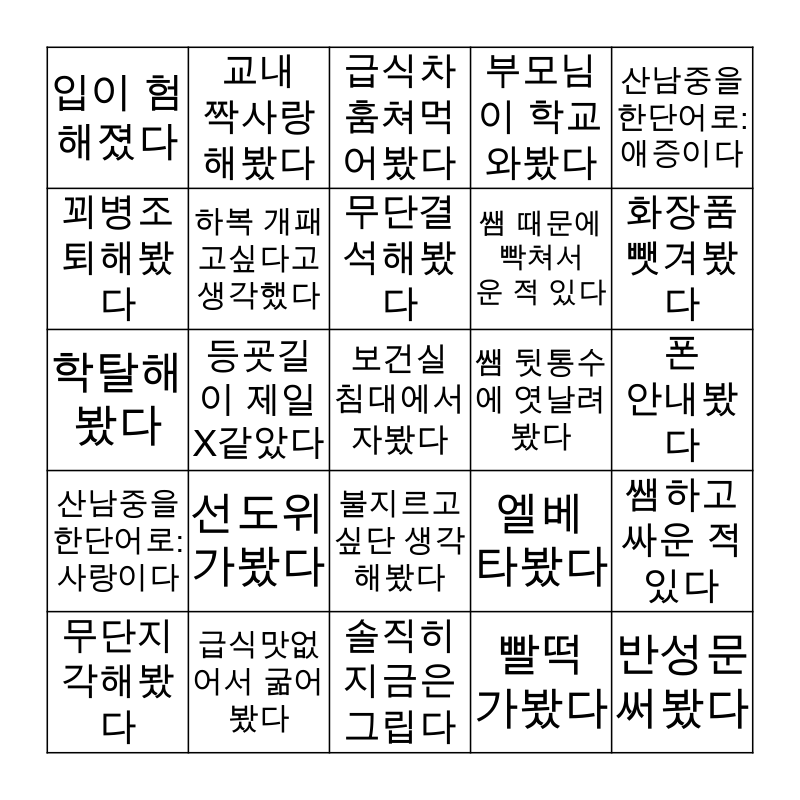 This bingo card has a free space and 24 words: 선도위 가봤다, 급식맛없어서 굶어봤다, 무단결석해봤다, 무단지각해봤다, 산남중을 한단어로: 애증이다, 입이 험해졌다, 꾀병조퇴해봤다, 교내 짝사랑 해봤다, 쌤 뒷통수에 엿날려봤다, 불지르고 싶단 생각해봤다, 쌤 때문에 빡쳐서 운 적 있다, 학탈해봤다, 엘베 타봤다, 쌤하고 싸운 적 있다, 하복 개패고싶다고 생각했다, 빨떡 가봤다, 폰 안내봤다, 급식차 훔쳐먹어봤다, 화장품 뺏겨봤다, 등굣길이 제일 X같았다, 반성문 써봤다, 산남중을 한단어로: 사랑이다, 부모님이 학교와봤다 and 솔직히 지금은 그립다.