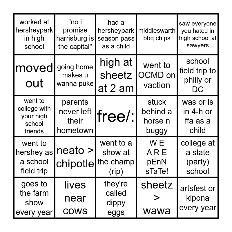 This bingo card has a free space and 24 words: neato > chipotle, lives near cows, high at sheetz at 2 am, goes to the farm show every year, saw everyone you hated in high school at sawyers, worked at hersheypark in high school, moved out, "no i promise harrisburg is the capital", stuck behind a horse n buggy, went to a show at the champ (rip), went to OCMD on vaction, went to college with your high school friends, W E A R E pEnN sTaTe!, college at a state (party) school, going home makes u wanna puke, sheetz > wawa, was or is in 4-h or ffa as a child, had a hersheypark season pass as a child, school field trip to philly or DC, parents never left their hometown, artsfest or kipona every year, went to hershey as a school field trip, middleswarth bbq chips and they're called dippy eggs.