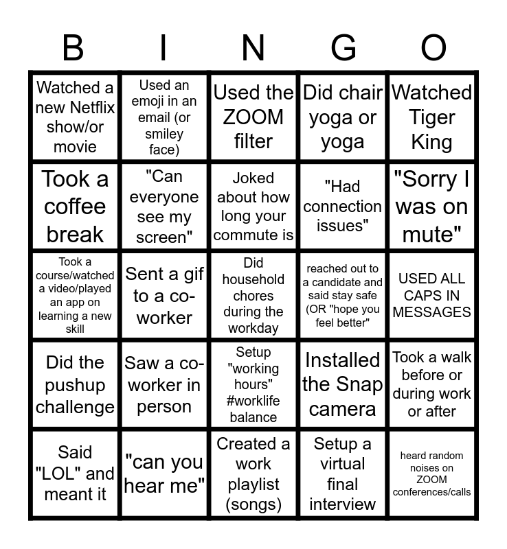 This bingo card has a free space and 24 words: Saw a co-worker in person, "can you hear me", Joked about how long your commute is, Said "LOL" and meant it, Watched Tiger King, Watched a new Netflix show/or movie, Took a coffee break, Used an emoji in an email (or smiley face), reached out to a candidate and said stay safe (OR "hope you feel better", Setup "working hours" #worklife balance, "Had connection issues", Took a course/watched a video/played an app on learning a new skill, Installed the Snap camera, Took a walk before or during work or after, "Can everyone see my screen", Setup a virtual final interview, USED ALL CAPS IN MESSAGES, Used the ZOOM filter, "Sorry I was on mute", Sent a gif to a co-worker, heard random noises on ZOOM conferences/calls, Did the pushup challenge, Did chair yoga or yoga and Created a work playlist (songs).