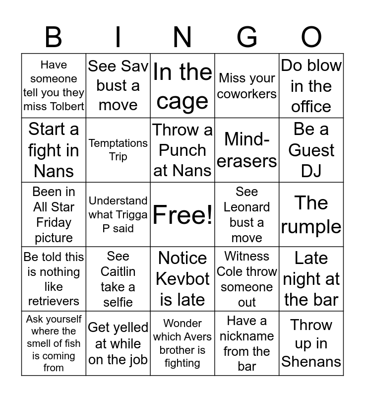 This bingo card has a free space and 24 words: See Caitlin take a selfie, Get yelled at while on the job, Throw a Punch at Nans, Ask yourself where the smell of fish is coming from, Do blow in the office, Have someone tell you they miss Tolbert, Start a fight in Nans, See Sav bust a move, See Leonard bust a move, Notice Kevbot is late, Mind-erasers, Been in All Star Friday picture, Witness Cole throw someone out, Late night at the bar, Temptations Trip, Have a nickname from the bar, The rumple, In the cage, Be a Guest DJ, Understand what Trigga P said, Throw up in Shenans, Be told this is nothing like retrievers, Miss your coworkers and Wonder which Avers brother is fighting.