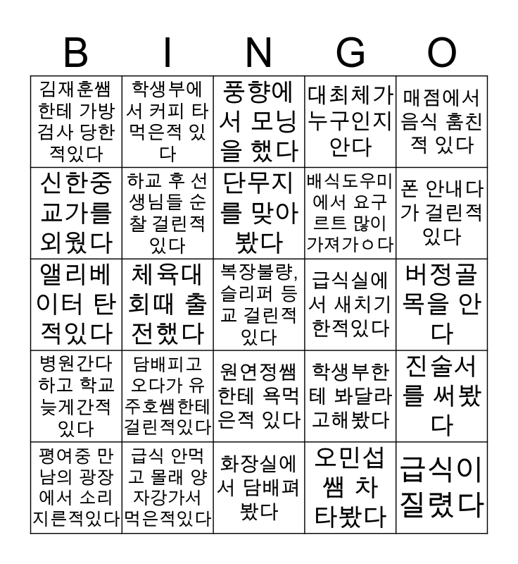 This bingo card has a free space and 24 words: 담배피고 오다가 유주호쌤한테 걸린적있다, 급식 안먹고 몰래 양자강가서 먹은적있다, 단무지를 맞아봤다, 평여중 만남의 광장에서 소리지른적있다, 매점에서 음식 훔친적 있다, 김재훈쌤한테 가방검사 당한적있다, 신한중 교가를 외웠다, 학생부에서 커피 타먹은적 있다, 급식실에서 새치기한적있다, 원연정쌤한테 욕먹은적 있다, 배식도우미에서 요구르트 많이 가져갔다, 앨리베이터 탄적있다, 학생부한테 봐달라고해봤다, 진술서를 써봤다, 하교 후 선생님들 순찰 걸린적있다, 오민섭쌤 차 타봤다, 버정골목을 안다, 풍향에서 모닝을 했다, 폰 안내다가 걸린적 있다, 체육대회때 출전했다, 급식이 질렸다, 병원간다하고 학교 늦게간적있다, 대최체가 누구인지 안다 and 화장실에서 담배펴봤다.
