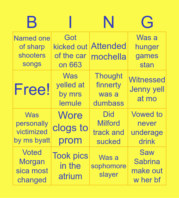 This bingo card has 16 words: Voted Morgan sica most changed, Took pics in the atrium, Attended mochella, Was a hunger games stan, Free!, Got kicked out of the car on 663, Did Milford track and sucked, Vowed to never underage drink, Named one of sharp shooters songs, Was yelled at by mrs lemule, Was a sophomore slayer, Witnessed Jenny yell at mo, Was personally victimized by ms byatt, Wore clogs to prom, Thought finnerty was a dumbass and Saw Sabrina make out w her bf.