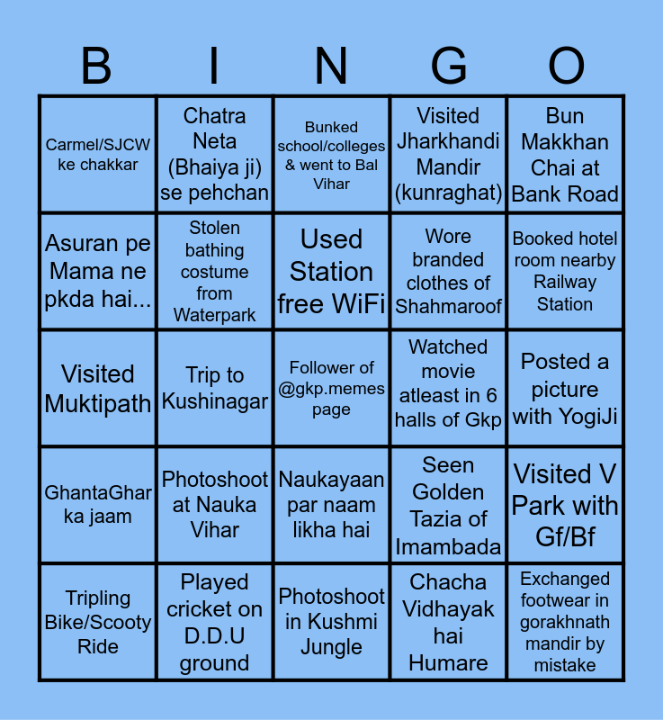 This bingo card has a free space and 24 words: Photoshoot at Nauka Vihar, Played cricket on D.D.U ground, Used Station free WiFi, Tripling Bike/Scooty Ride, Bun Makkhan Chai at Bank Road, Carmel/SJCW ke chakkar, Asuran pe Mama ne pkda hai..., Chatra Neta (Bhaiya ji) se pehchan, Watched movie atleast in 6 halls of Gkp, Naukayaan par naam likha hai, Wore branded clothes of Shahmaroof, Visited Muktipath, Seen Golden Tazia of Imambada, Visited V Park with Gf/Bf, Stolen bathing costume from Waterpark, Chacha Vidhayak hai Humare, Posted a picture with YogiJi, Bunked school/colleges & went to Bal Vihar, Booked hotel room nearby Railway Station, Trip to Kushinagar, Exchanged footwear in gorakhnath mandir by mistake, GhantaGhar ka jaam, Visited Jharkhandi Mandir (kunraghat) and Photoshoot in Kushmi Jungle.