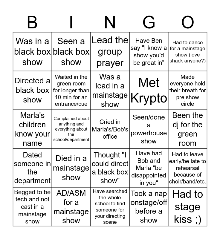 This bingo card has a free space and 24 words: Died in a mainstage show, AD/ASM for a mainstage show, Was a lead in a mainstage show, Begged to be tech and not cast in a mainstage show, Had to dance for a mainstage show (love shack anyone?), Was in a black box show, Directed a black box show, Seen a black box show, Seen/done a powerhouse show, Thought "I could direct a black box show", Met Krypto, Marla's children know your name, Have had Bob and Marla "be disappointed in you", Had to leave early/be late to rehearsal because of choir/band/etc., Waited in the green room for longer than 10 min for an entrance/cue, Took a nap onstage/off before a show, Been the dj for the green room, Lead the group prayer, Made everyone hold their breath for pre show circle, Complained about anything and everything about the school/department, Had to stage kiss ;), Dated someone in the department, Have Ben say "I know a show you'd be great in" and Have searched the whole school to find someone for your directing scene.