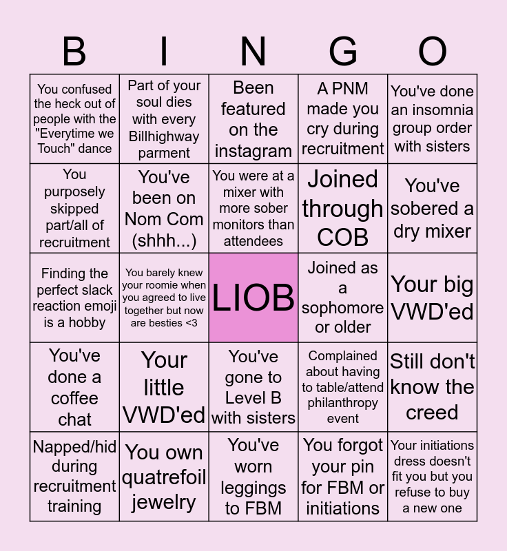 This bingo card has a free space and 24 words: Your little VWD'ed, You own quatrefoil jewelry, You were at a mixer with more sober monitors than attendees, Napped/hid during recruitment training, You've done an insomnia group order with sisters, You confused the heck out of people with the "Everytime we Touch" dance, You purposely skipped part/all of recruitment, Part of your soul dies with every Billhighway parment, Joined as a sophomore or older, You've gone to Level B with sisters, Joined through COB, Finding the perfect slack reaction emoji is a hobby, Complained about having to table/attend philanthropy event, Still don't know the creed, You've been on Nom Com (shhh...), You forgot your pin for FBM or initiations, Your big VWD'ed, Been featured on the instagram, You've sobered a dry mixer, You barely knew your roomie when you agreed to live together but now are besties <3, Your initiations dress doesn't fit you but you refuse to buy a new one, You've done a coffee chat, A PNM made you cry during recruitment and You've worn leggings to FBM.
