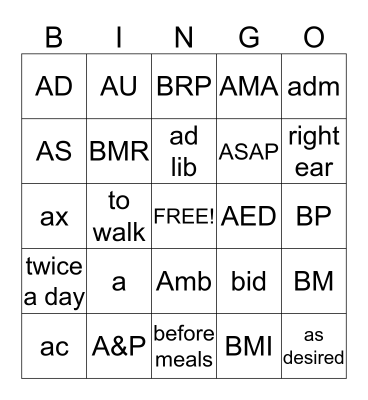 This bingo card has a free space and 24 words: a, A&P, ad lib, ac, adm, AD, AS, AU, AED, Amb, ASAP, ax, bid, BM, BMR, BMI, BP, BRP, right ear, to walk, as desired, twice a day, AMA and before meals.