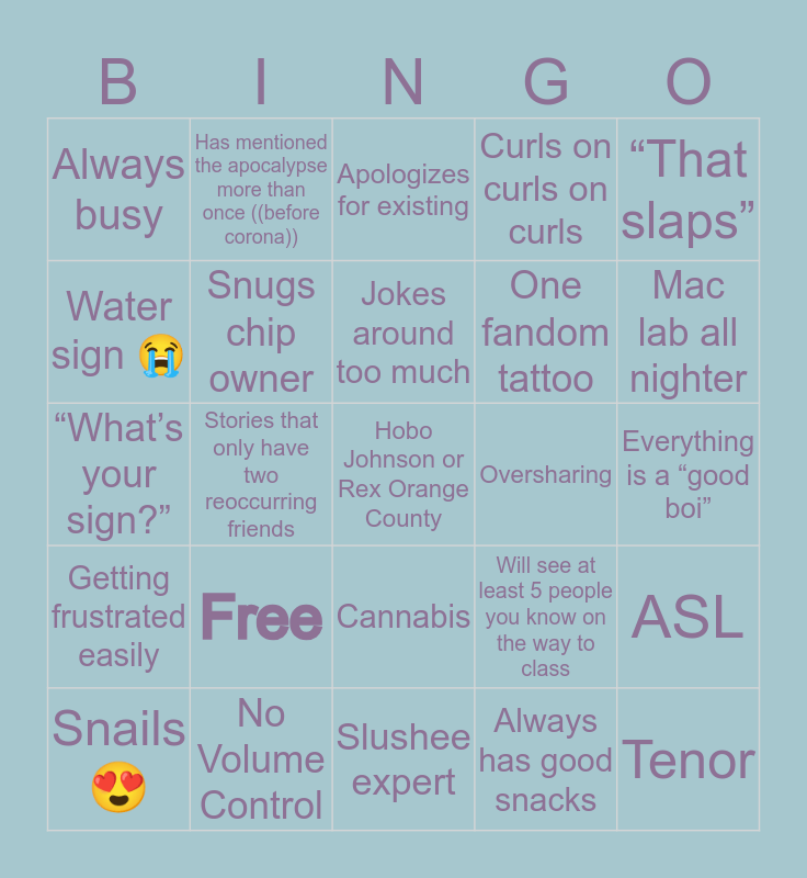 This bingo card has a free space and 24 words: Free, No Volume Control, Jokes around too much, Snails 😍, “That slaps”, Always busy, Water sign 😭, Has mentioned the apocalypse more than once ((before corona)), Oversharing, Cannabis, One fandom tattoo, “What’s your sign?”, Will see at least 5 people you know on the way to class, ASL, Snugs chip owner, Always has good snacks, Everything is a “good boi”, Apologizes for existing, Mac lab all nighter, Stories that only have two reoccurring friends, Tenor, Getting frustrated easily, Curls on curls on curls and Slushee expert.